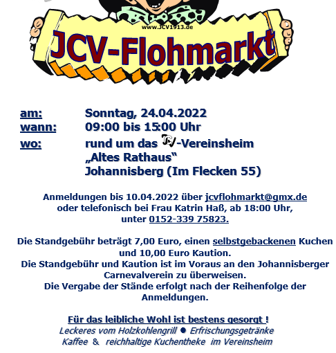 Am 24.04.2022 startet der JCV seine Aktivitäten mit dem traditionellen Flohmarkt in Johannisberg. Anmeldungen sind bis zum 10. April 2022 per Email […]