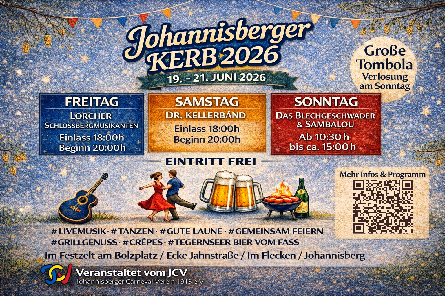 JCV ZELT Boltzplatz Johannisberg Flecken, Geisenheim, Hessen, DeutschlandVom 19. bis 21. Juni 2026 heißt es wieder: Feiern, Freunde treffen und das Leben genießen – bei der Johannisberger Kerb im Festzelt am Bolzplatz. Der Eintritt ist frei! 🎪 Der Freitag startet mit den Lorcher Schlossbergmusikanten – zünftige Partymusik und beste Festzeltstimmung garantiert. 🎶🍺 Am Samstagabend wird weiter gefeiert, wenn die Band Sambalou mit […]